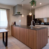 キッチンは重厚感あるカウンターと美しい木目の面材が引き立つようリビング向きの対面型に。家族の顔を見ながらお料理を楽しめるようになりました。周囲はホワイト系でまとめ、カントリー調だったLDKをスタイリッシュに。キッチンが一層際立つ空間になりました。