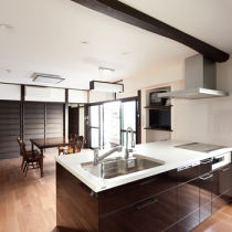長年の間、地域の人々に親しまれてきた庫裡(くり:お寺の台所)。築80年近く経ち、段差や設備の老朽化が気になっていました。大勢のお客様が集まることもあるので、台所と居間の間の段差を解消し、バリアフリーに。下がり壁を撤去して、ワンフロアーのLDKを創出。会話が弾むように対面式のキッチンとし、数人が同時に作業できるように、カランも2カ所に取り付けました。柱や梁には元の風合いを活かした塗装を施し、キッチンはダークチーク柄でコーディネイト。和の佇まいと最新設備が調和した、美しい空間がお客様を迎えます。施工店: 平和住宅建設株式会社 平和住宅リフォーム (旧:リファイン大久保)