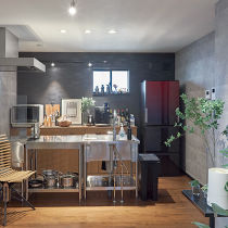 キッチンは自らカフェの厨房に立つH様が使い慣れた厨房機器を選択。メタルな質感が映えるアイランドスタイルに。開放感を高めるためLDKに隣接する寝室の壁は、縦格子の建具でゆるやかに仕切りました。照明はすべて集光タイプで、陰影のある空間を演出。コンクリート調の壁は、年を重ねても違和感のない色調のものを選び、落ち着いた印象に仕上げました。