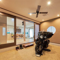 実家を受け継いだM様は大好きなバイクのため、未活用の和室部分のリフォームを決意。大胆に和室2部屋を使い、玄関を兼ねたインナーガレージを創造。バイクを手入れしながらも、家族の存在を感じられるようLDKとは透明ガラスの大型引き戸で仕切りました。リビングからもいつでもバイクを愛でることができます。
