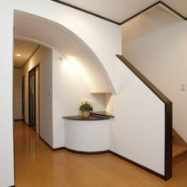 そこで階段下には大らかな丸みをつけ、その下にできたコーナーには扇形の飾り棚を設置。2つの曲面で構成される造形美が、優美な気品を醸し、家の格式をも静かに伝えます。「お客様が皆この玄関のことを誉めてくださる」とご一家は大満足。階段位置の変更だけでなく、LDKの拡張など間取りも大幅変更。それに伴って筋交いや鉄骨梁などで耐震補強も行いました。施工店: 株式会社U建築(旧:リファイン飯田)