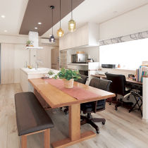 駐車場が住まいの裏手にあり、玄関への動線に不便を感じておられたご夫婦。設備の老朽化も気になられ、ご来店されました。駐車場からすぐ家に入れる勝手口を、というご要望でしたが、敢えてもうひとつの玄関をご提案。買い物から帰ったら、そのままダイニングキッチンのパントリーに荷物をしまえるようにしたので、とてもラクになったと喜んでいただけました。ご主人のこだわりは、白基調のインテリア。木目が美しいホワイトオーク柄の床をLDKにも廊下にも採用し、家全体をコーディネイト。内装ドアと下がり天井を濃い目の色にしたことで、空間に奥行きが生まれました。デザインの異なる3色のペンダント照明は、娘さんがショウルームの喫茶コーナーでご覧になって即決されたもの。好きなインテリアに囲まれたLDKで、どこにいても家族の顔が見えることに幸せを感じる、と喜んでおられます。施工店: 株式会社ナイスホーム(旧:リファイン安城)