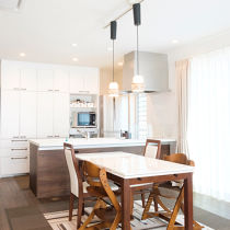 長年の間、地域の人々に親しまれてきた庫裡(くり:お寺の台所)。築80年近く経ち、段差や設備の老朽化が気になっていました。大勢のお客様が集まることもあるので、台所と居間の間の段差を解消し、バリアフリーに。下がり壁を撤去して、ワンフロアーのLDKを創出。会話が弾むように対面式のキッチンとし、数人が同時に作業できるように、カランも2カ所に取り付けました。柱や梁には元の風合いを活かした塗装を施し、キッチンはダークチーク柄でコーディネイト。和の佇まいと最新設備が調和した、美しい空間がお客様を迎えます。施工店: 平和住宅建設株式会社 平和住宅リフォーム (旧:リファイン大久保)