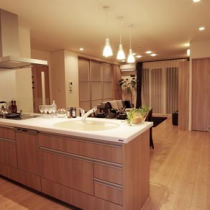 お子様が自立し、ご夫婦での生活をよりよくしたいと、リフォームされたA様。かつての台所と和室廊下を一体化。LDKへと生まれ変わらせました。新たに誕生した、広く明るい空間はA様の自慢です。照明にもこだわり、ダウンライトやブラケットなどで広がりと落ち着きを演出しています。キッチンも十分なスペースを確保し、対面式に。リビングで寛ぐご主人様に背を向けることがなく、料理中でもご夫婦の会話が弾みます。「台所に立つ楽しみが広がりました」と奥様はご機嫌。またトイレや洗面室も車いすでも入ることができるように拡張し、将来も安心です。施工店: 旭ハウジング株式会社(旧:リファイン日野)