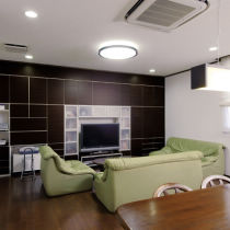 壁面収納を設置。二世帯7人の大家族がくつろぐLDKが、すっきりと片付きました。施工店: 株式会社アルフレッシュ(旧:リファイン津みなみ)