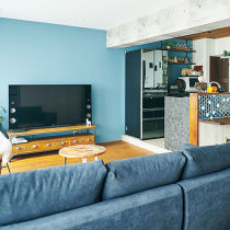 床材は明るい色を選び、キッチンに立ったとき正面になる壁だけを濃いブルーに。空間を引き締めながら、個性的なキッチンに仕上がりました。