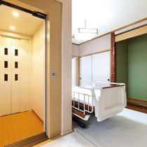 急なご病気で車いすでの生活となった家族のために設置したのは、2階の寝室と1階の車庫をつなぐホームエレベーター。前後二方向に出入口があるので、乗り降りの際、車いすの向きを変える必要がありません。コンクリートの車庫のホールには断熱材を入れ、冷気の吹き込みを防止。また、部屋の段差をなくし、トイレに手すりをつけるなど、車いす生活を不自由なくサポートできるよう配慮しました。施工店: 株式会社リファインむろらん(旧:リファインむろらん)