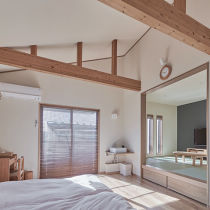 1階リビングの吹き抜けをなくして、2階の生活空間を広げたいと考えておられたご夫婦。2階のリビングで愛犬とくつろぎたいというご要望を受け、吹き抜けとトイレがあった場所に畳が丘を設置して4.5畳のリビングに。さらに、洋室とウォークインクローゼットを寝室と書斎に変えるという、思い切った間取り変更をご提案しました。