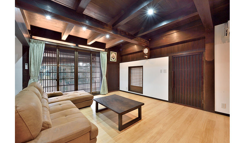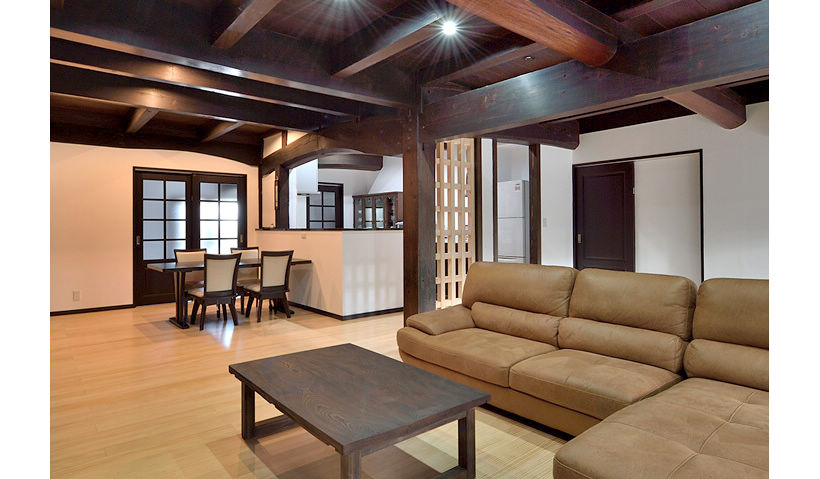 熊本地震で傷んでしまったK様邸。築100年以上という思い出のある家を残すため、リフォームを選ばれました。梁や天井、欄間はそのまま使用。押入などの扉材は建具として再利用し、新たな暮らしに引き継ぎました。従来の雰囲気は残しながら、明るく開放的な古民家の情緒引き立つ住まいに甦りました。