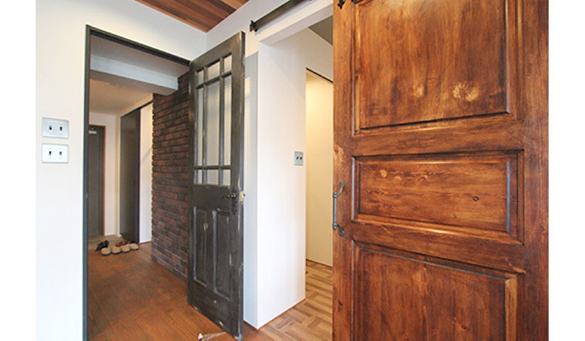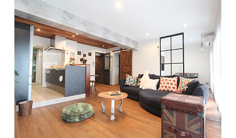 間取りを変更する上で、一番こだわったのはリビングの広さ。過ごす時間が一番長い場所を広々と設計したことで、日常の暮らしも、友人を招いた際にも、窮屈なく快適に過ごしやすいリビングに。キッチンはPanasonicのラクシーナを使用。扉柄も今人気のヴィンテージメタル柄に。オトナヴィンテージ空間にはとてもマッチング!無垢の木やレンガ、タイル、アイアン等を駆使した素材感や、特別な塗装で仕上げ、独特な味わいを出した建具などこだわりのリノベーション。