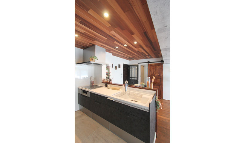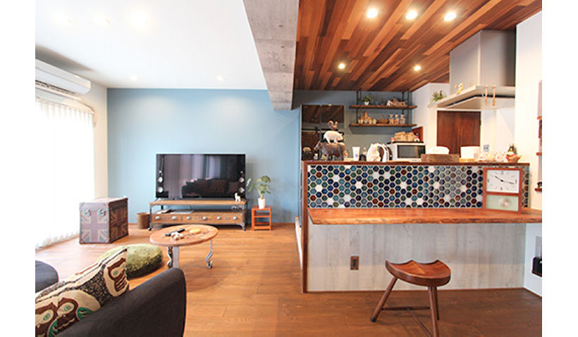林 今回特にこだわったのは、深い味わいを感じられる自分好みの空間にすること。間取りとしては、家事動線を意識し、キッチン→洗面室→玄関へ行ける回遊式の間取り。また、一番こだわったのはリビングの広さ。過ごす時間が一番長い場所を広々と設計したことで、日常の暮らしも、友人を招いた際にも、窮屈なく快適に過ごしやすくなった。パーテーションで仕切られた空間は、趣味スペースや室内干しスペースとして活躍。キッチン裏側の壁には無垢カウンターと六角タイルを施工。味のある建具は、ヴィンテージテイストに塗装。シューズクロークと玄関に設置した照明器具は空間のアクセサリーに。夜になるとより一層あたたかくまわりを照らす。洗面化粧台など水が飛びはねやすい壁にはタイルを施工。ウォークインクローゼットの内装仕上げは、13種類もの壁紙を採用。冬の寒さ、結露対策として、インナーサッシを採用。広い空間でも寒さを感じないようになった。