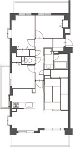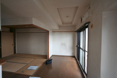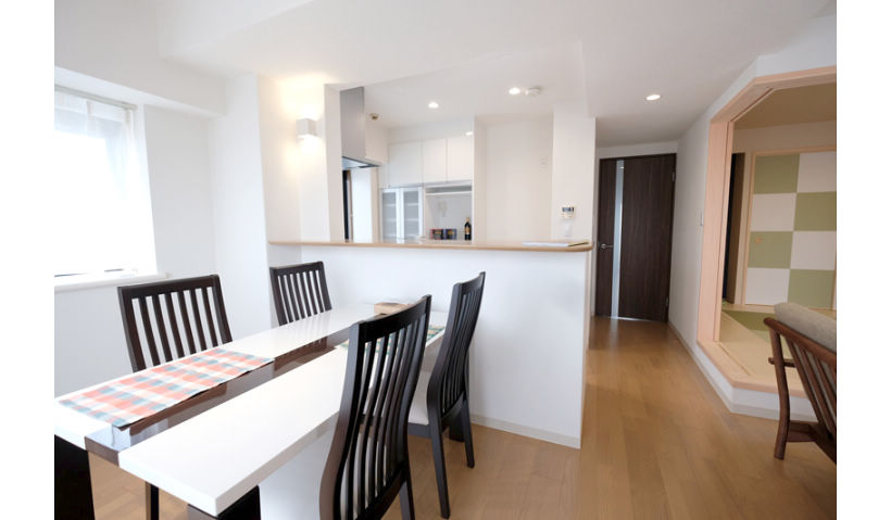 アフター:4LDKを3LDKの間取りに変更 リビングは無垢材を貼り和室にはクロスで部屋をアクセントにしました 設備を入れ替えマンションが蘇りました