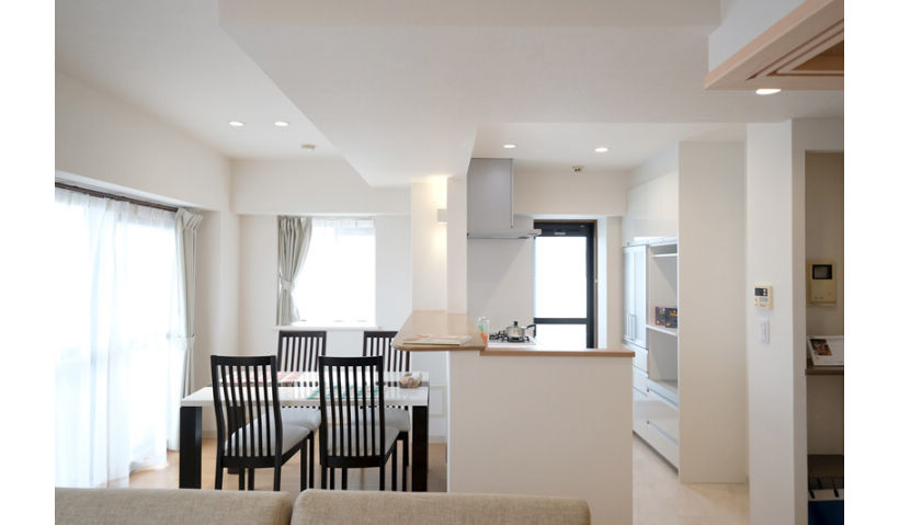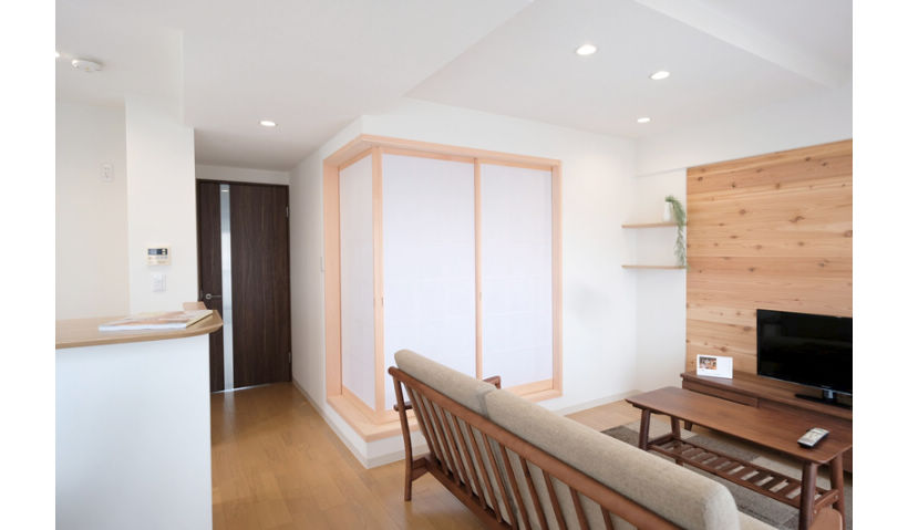 布目 リビングの空間を広げたり、2つの部屋を1つの部屋にしたりすることで、全体的に空間にゆとりがでるように改装しました。また和室には特にこだわり、LDKのアクセントとしても映え、ひとつの部屋としても使えるようプランニング。リビングの壁には無垢の板を使い、落ち着いた雰囲気をご提案しました。