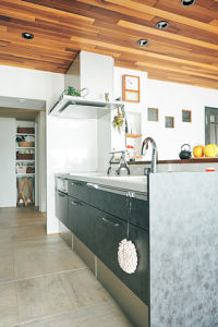 アフター:キッチンはグレー基調でまとめるなど、空間ごとの色調に変化をつけてメリハリをプラス。レンジフードは10年掃除不要のモデルを選択。