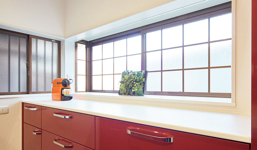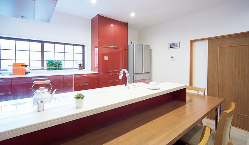 近所に住む娘夫婦や孫、両親が集まって食事ができる場にしたかったので、カウンターテーブル付きのキッチンにして正解でした。料理をしながら家族とおしゃべりできて嬉しいです。ショウルームで一目惚れしたルージュレッドのキッチンは使いやすくて高級感もあり、気に入ってます。