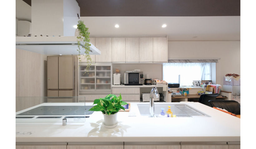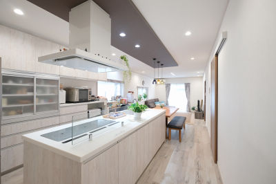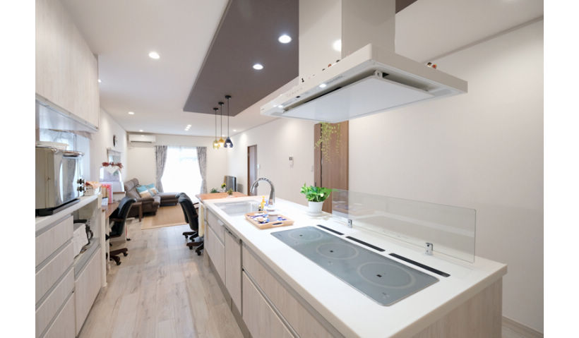 ご主人様の要望でホワイトカラーでまとめたコーディネート アクセントで天井の一部を下げ、色を入れポイントにしました キッチンはアイランドタイプ また大容量のカップボード収納にこだわりました